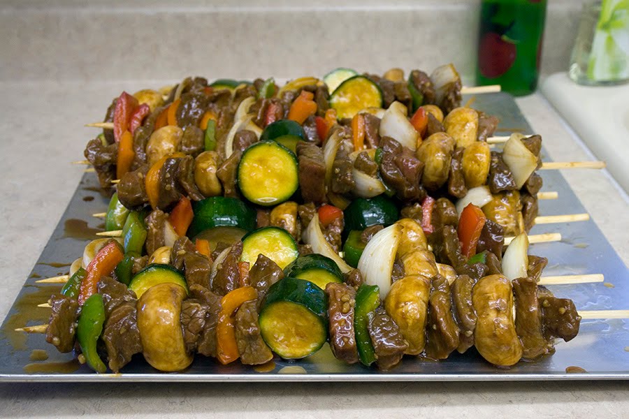 When ready to start cooking, soak the wooden shish kabob skewers in water for about 15 minutes. Add meat and veggies to the skewers in whatever order suits your fancy. Save the leftover veggie marinade, but discard the meat marinade.